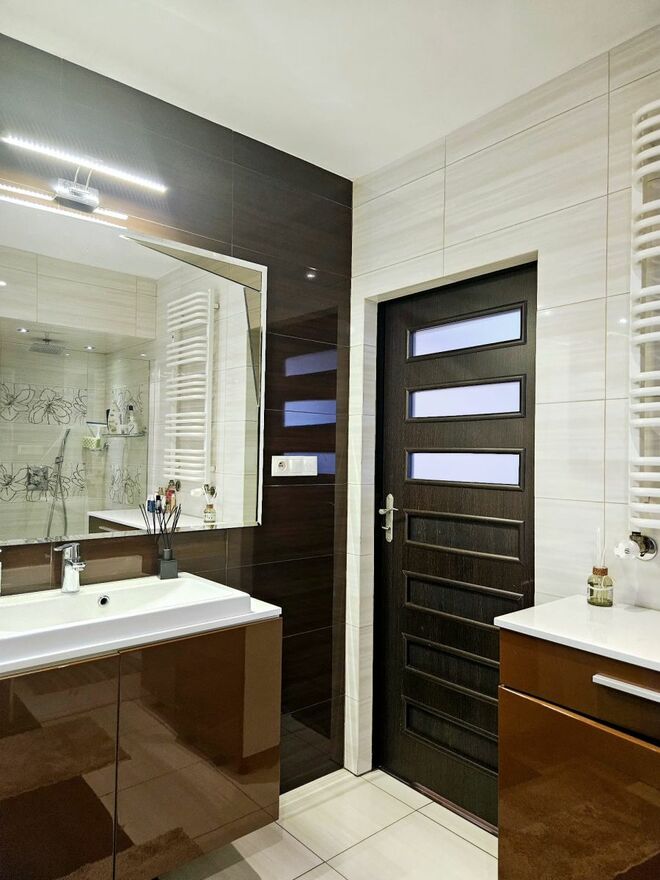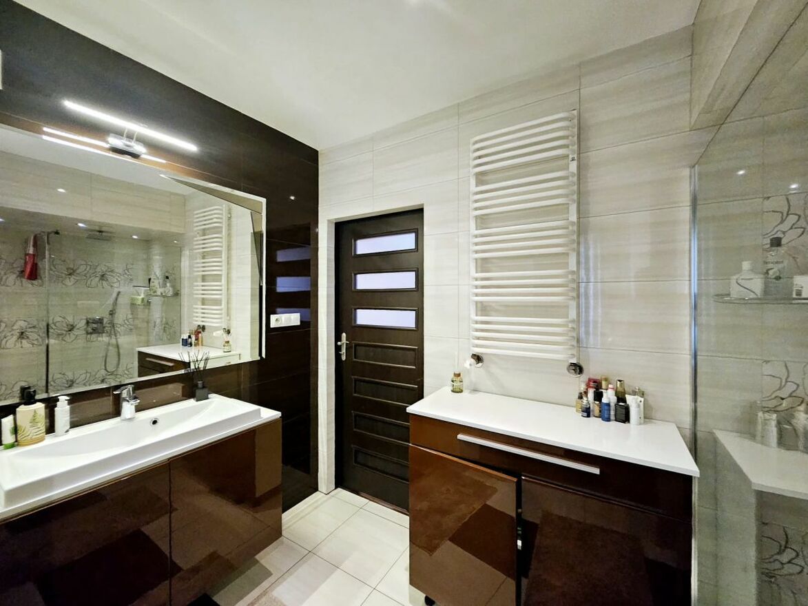 Na piętrze znajdują się 3 duże sypialnie (1 z balkonem) oraz duża łazienka. Jest również wyjście na poddasze, dodatkowe pomieszczenie do przechowywania. Nowoczesna i przestronna kuchnia wyposażona w niezbędne sprzęty, w tym podwójna lodówką (side by side) i zmywarka.